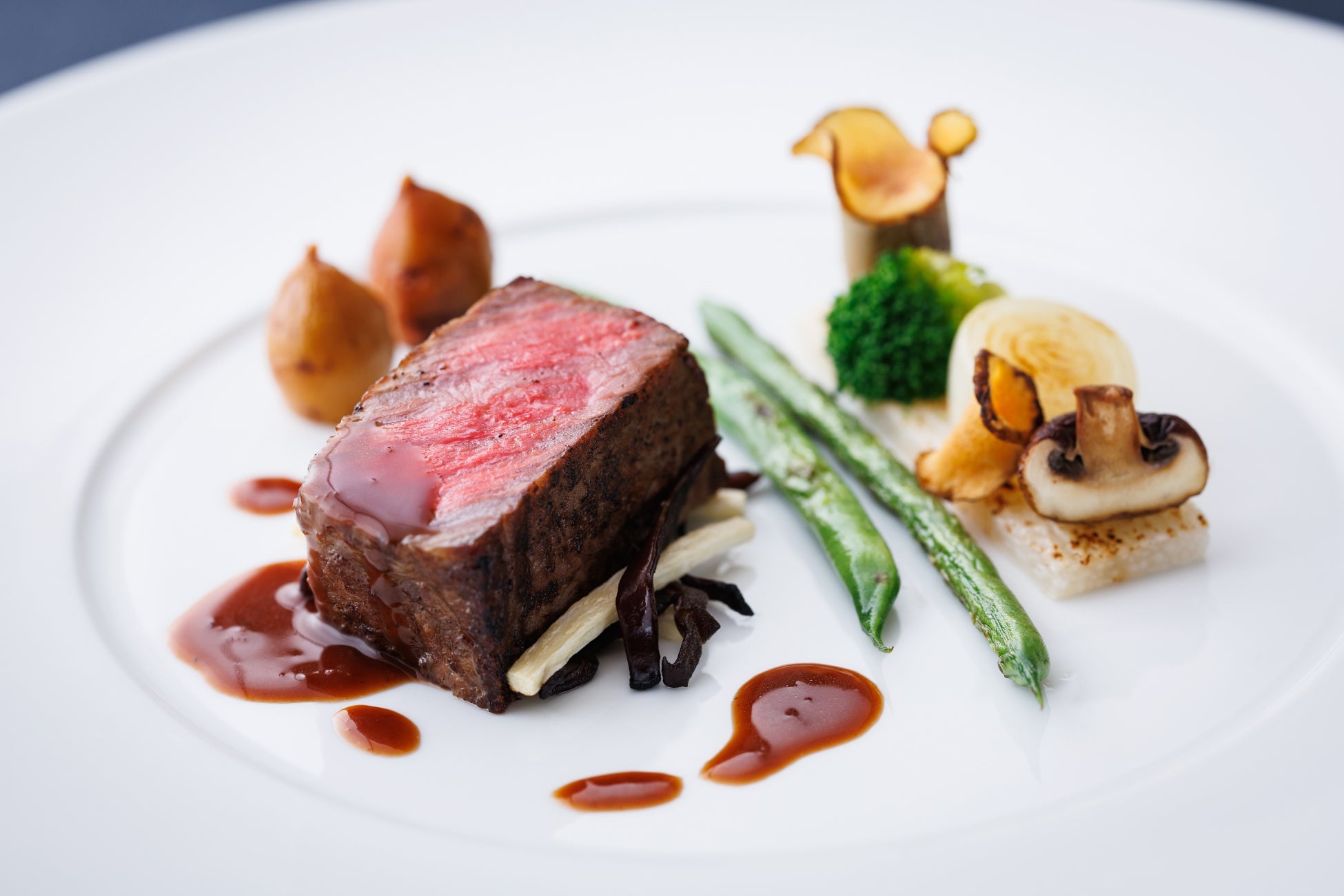 赤身の旨味と適度な霜降りのバランスが良く柔らかい食感のサーロインに、濃厚なマデラソースを合わせました。肉厚でこりこりとした食感の“青森きくらげ”と、ほくほくとして甘みのあるアピオスを添えております。