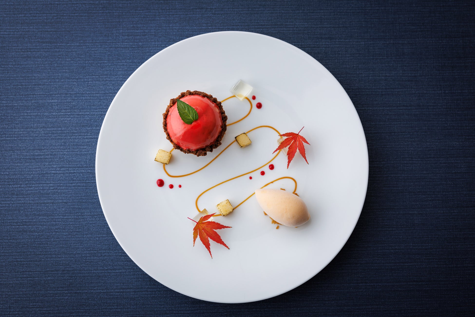 パイ生地の上に、じっくりとローストして風味を凝縮させたりんごと柚子のゼリー寄せを重ね、アーモンドクリームを組み合わせております。パティシエこだわりの爽やかな和のアクセントが光る一皿をお楽しみください。