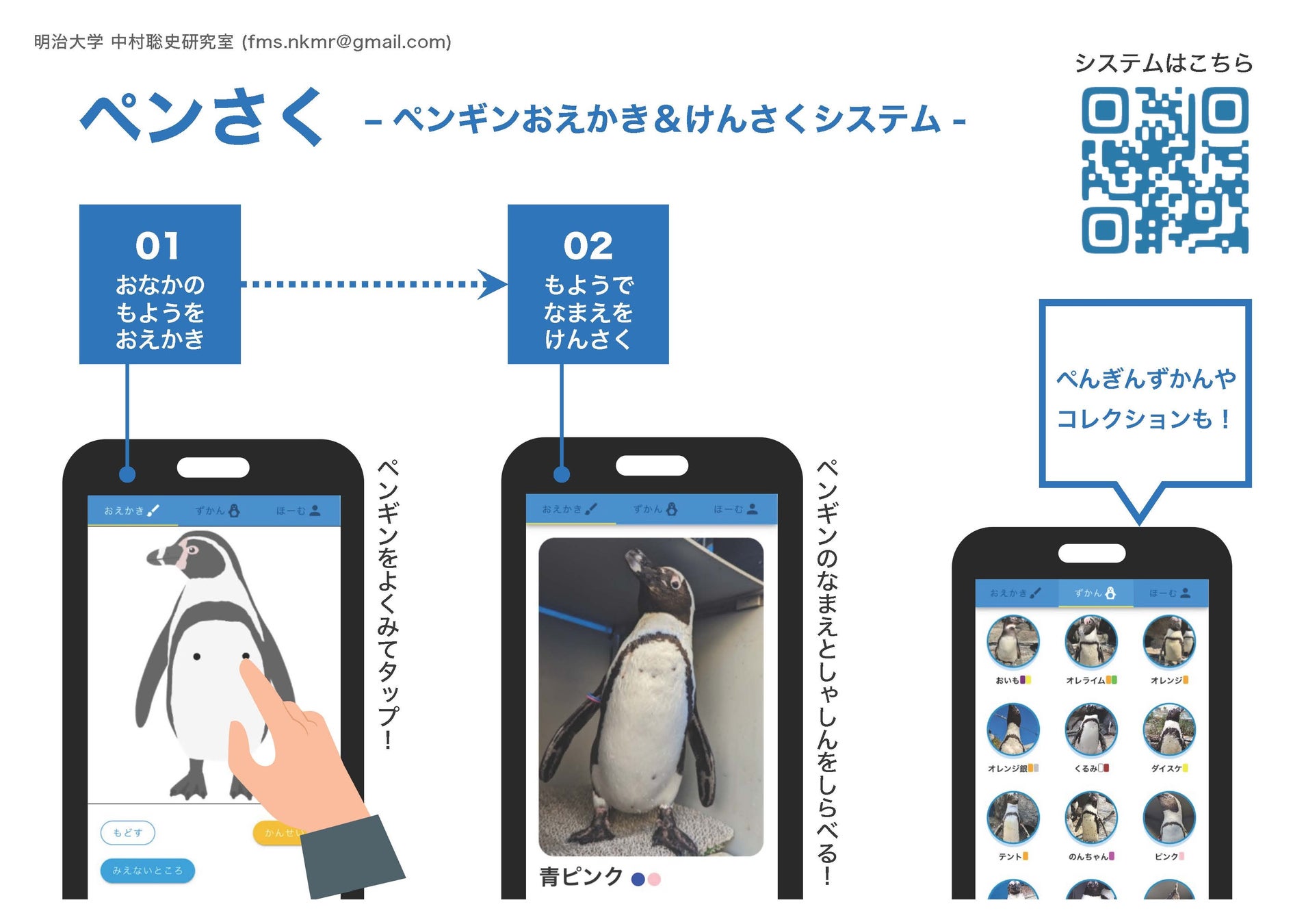 明治大学の学生が開発したこのペンギンの個体識別システム「ペンさく」は、ペンギンのお腹の模様を“ぬりえ”感覚で入力することで個体を識別できるという、今までにないものであり、日本初のシステムです。