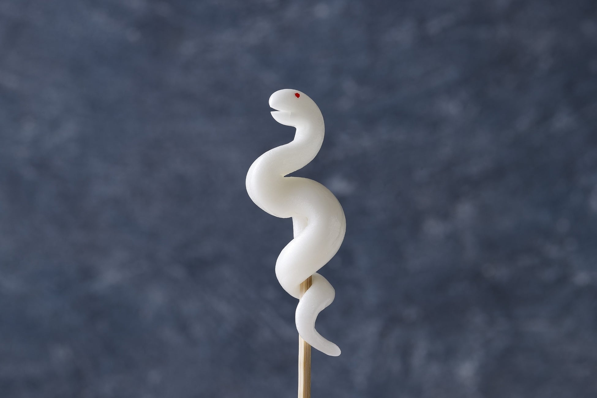 江戸時代より続く伝統の細工菓子。握りばさみ1本で2025年の干支・ヘビを作ります。ワークショップのほか実演販売もいたします。