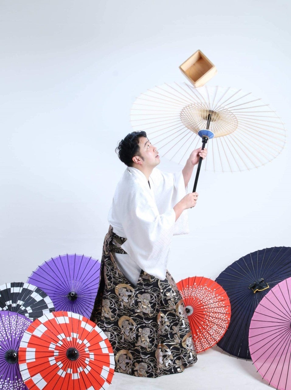 傘回しなどの大技のほか、はさみを巧みに操る紙切りなど、日本の伝統芸を披露します。