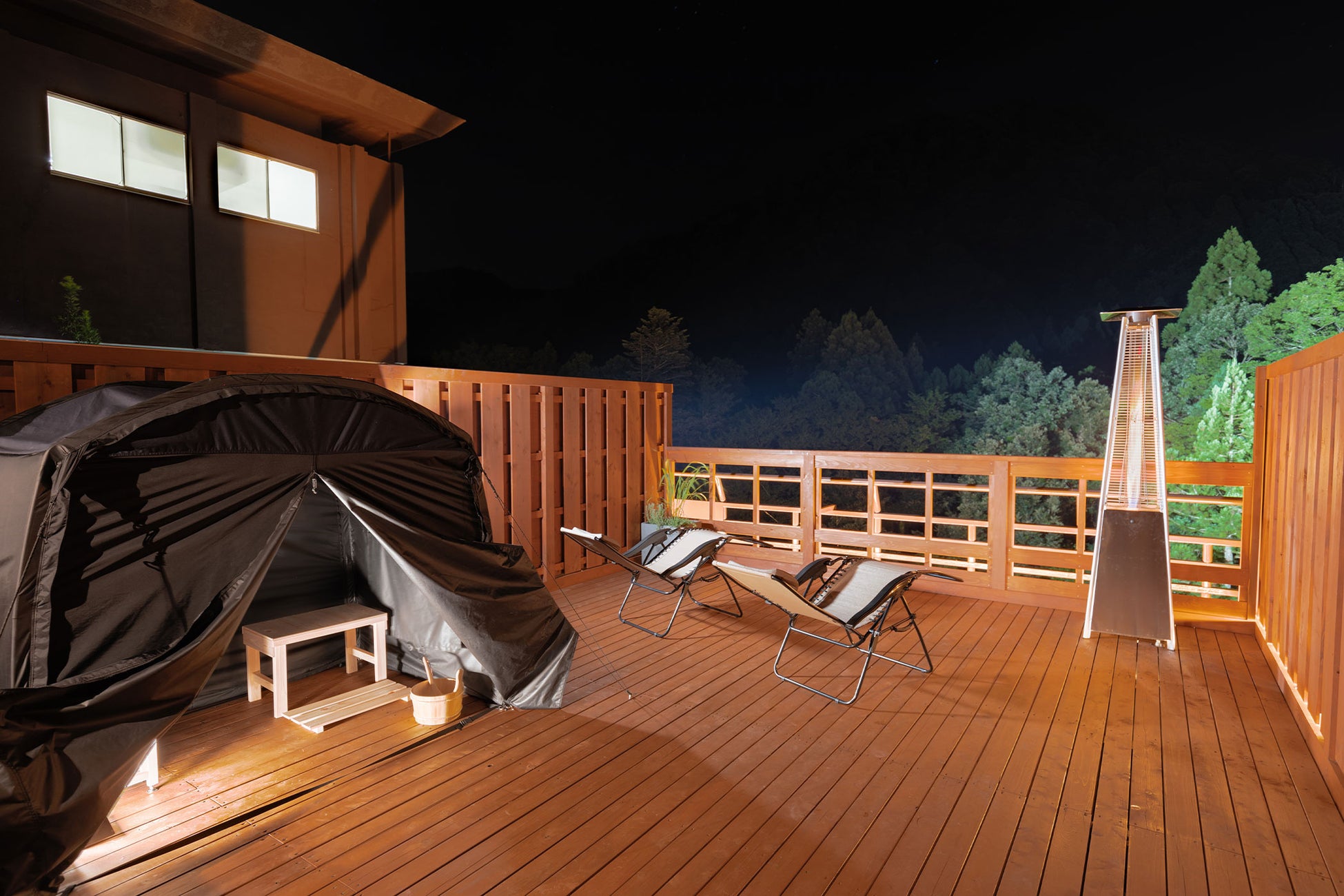 ウッドデッキのオープンテラスでテントサウナをお楽しみいただけます。ロウリュや水風呂もあり、プライベートではなかなか味わうことができない、贅沢なサウナ時間を満喫できます。