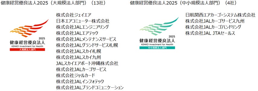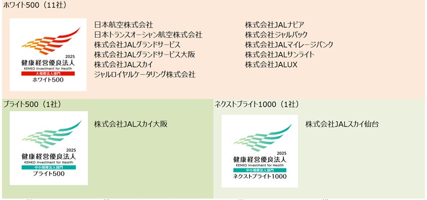 JALグループ30社は、日本健康会議による「健康経営優良法人2025」(*1)に認定され、そのうち、大規模法人上位に認定されるホワイト500(*2)に11社、中規模法人上位に認定されるブライト500(*3)に1社、また今年度から新たに設定された中規模法人上位501~1500社のネクストブライト1000(*4)に1社が認定されました。