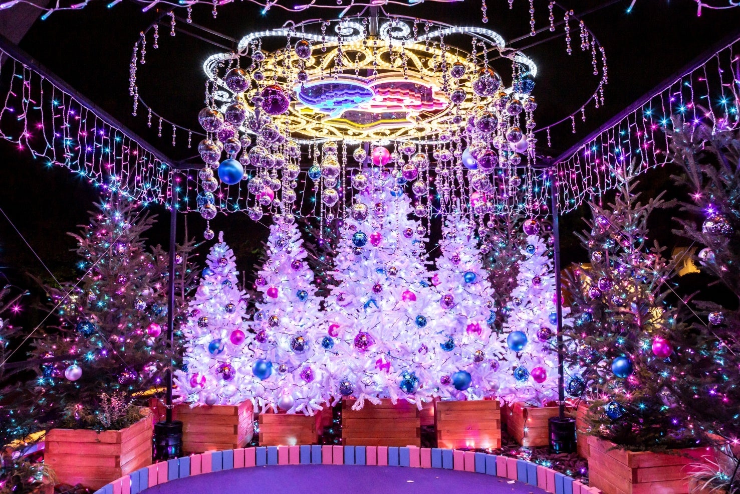 「Twinkle GARDEN」のエリアは、フォトジェニックな空間で、ピンクと水色に輝く光と、リボンのオーナメントがかわいいホワイトツリーが広がり、キキ&ララの色とりどりの星空の世界を演出します。