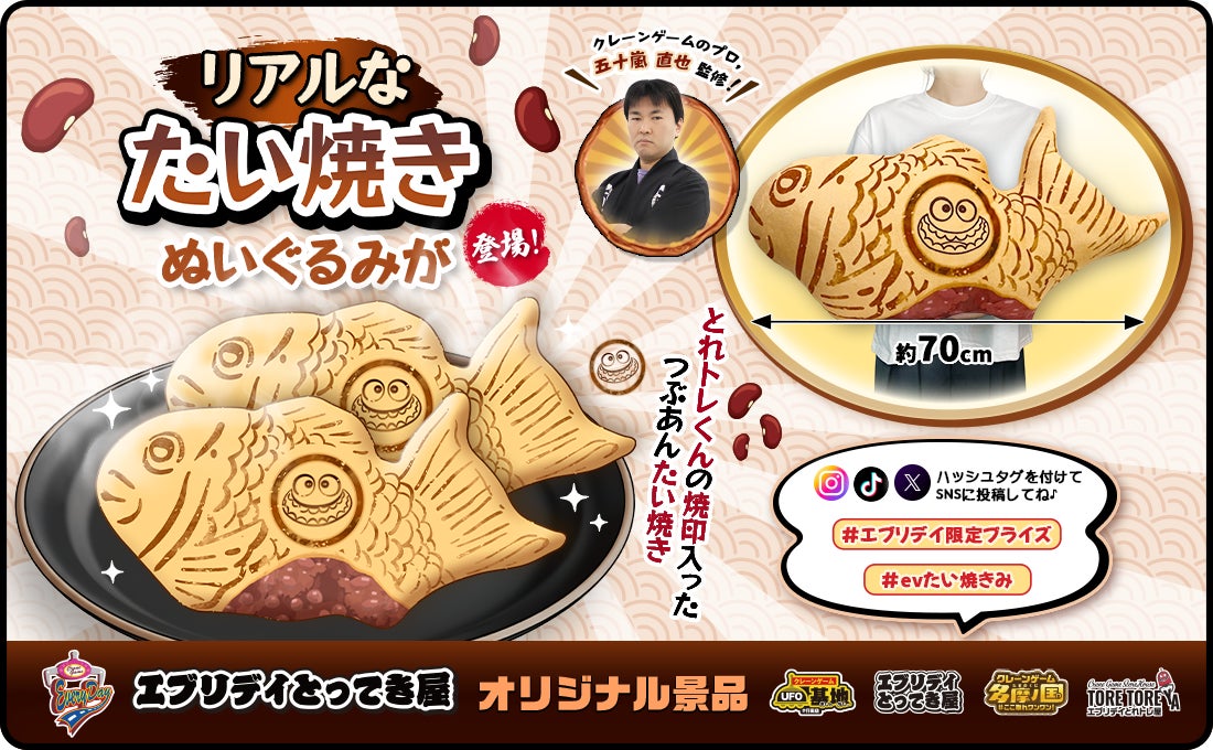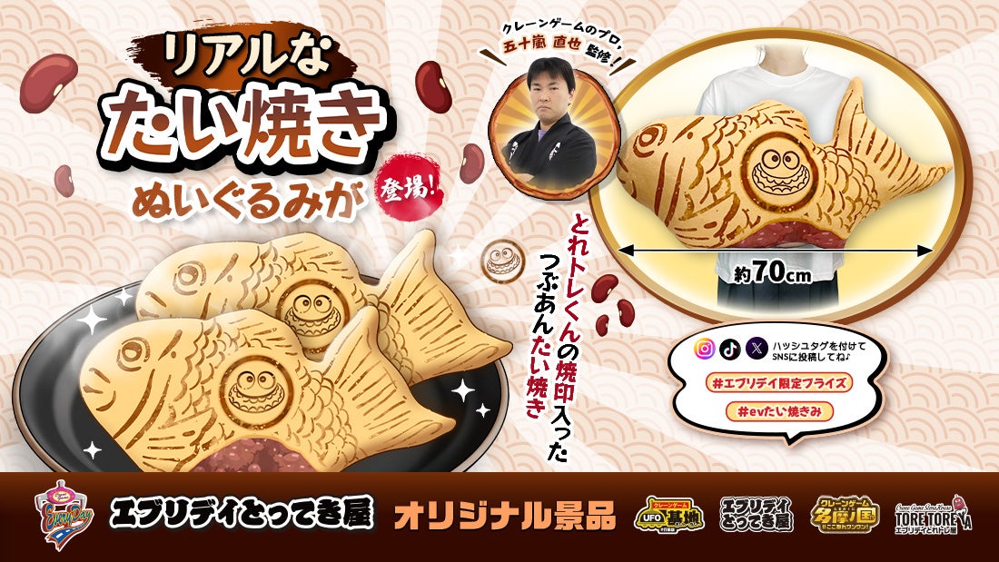 「笑顔創造」が企業理念の株式会社東洋(代表取締役:中村秀夫/本社:埼玉県桶川市以下、当社)は、当社が展開するクレーンゲーム景品シリーズ「エブリデイ オリジナル景品」として、新たにクレーンゲームのプロ監修の「リアルなたい焼きぬいぐるみ」が登場します。