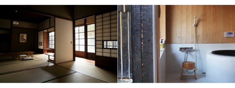 石畳の路地に並ぶ二戸一棟の長屋の一つを活用した大正時代に建てられ、間取りの一部が“角”のように突き出していることから「角屋(ツノヤ)」と名付けられています。前庭を望む土間の寝室は、天井高のある開放的な空間。漆喰壁の質感と相まって、和と洋が心地よく混ざり合う独自の空気感を醸し出しています。縁側と土壁に囲まれた昔ながらの和室と、ベッドを備えた洋風の土間が一つの建物の中に同居し、滞在者が二つの異なる雰囲気を味わえる魅力的な町家です。