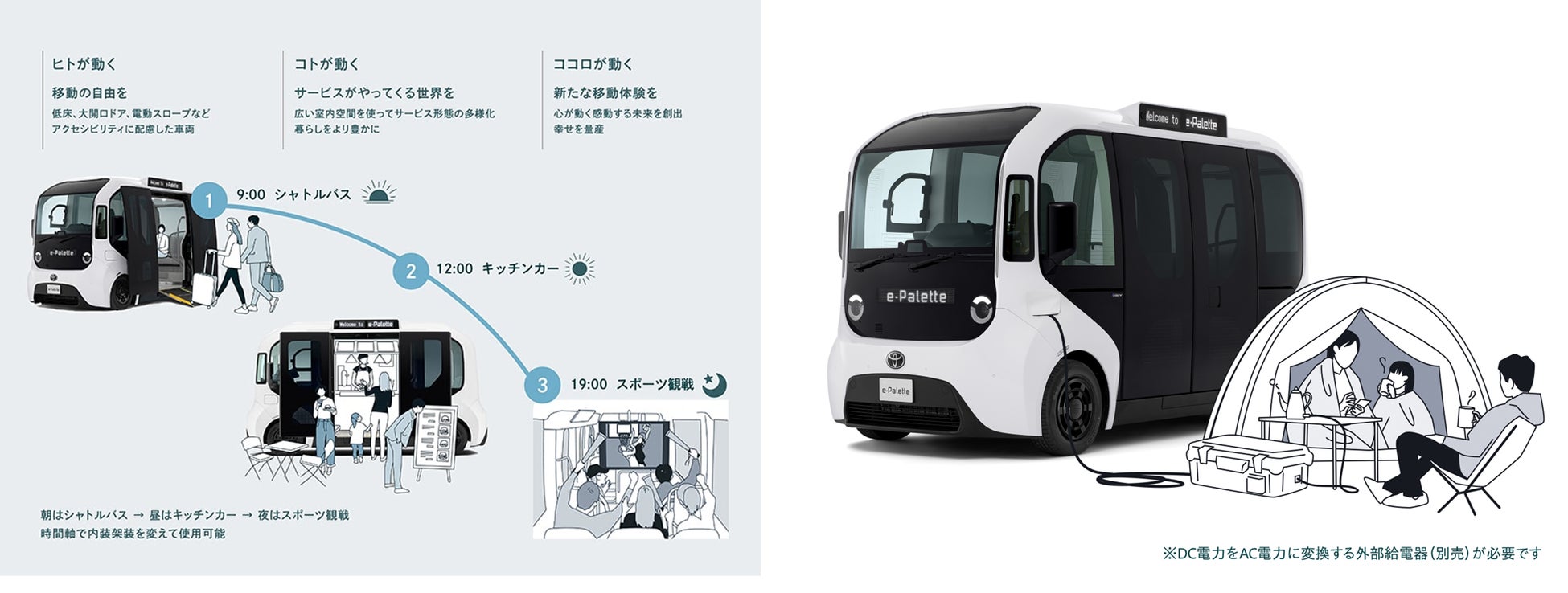 e-Paletteは、広い室内空間や大型ウインドウガラスによる開放感を活かして、人々の移動手段にとどまらず移動する店舗やサービス空間など、一台のクルマを使ってさまざまなモビリティサービスに対応可能なモビリティです。広い車内空間を活かし、人の移動だけでなく、移動販売やサービス提供など多様な用途に対応できる設計となっており、地域や利用シーンに応じて柔軟な活用が可能です。また、EVとして走行時にCO₂や排気ガスを排出せず、給電機能を備えていることから、平時の移動に加え、災害時の非常用電源としての活用も期待されています。