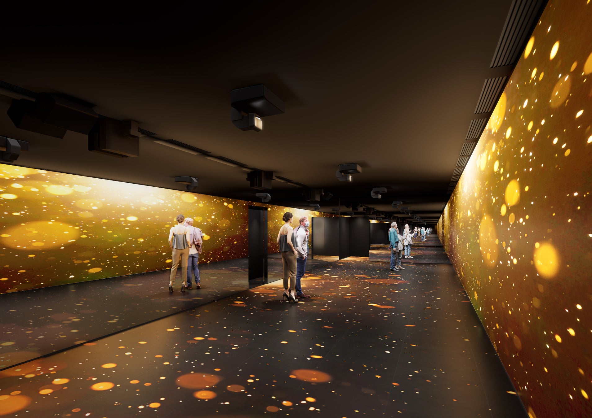 無限に反射するミラーが、地平線の彼方まで広がるようなパノラマ空間を演出。映像が壁面や床へとシームレスに溶け込み、視覚のスケール感を拡張する、新たな映像体験をお楽しみいただけます。
