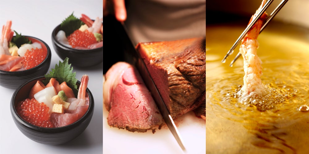 ホテルの王道メニューもバラエティ豊かに取り揃えております。いくらやマグロなど、お好みの海鮮がのせ放題のオリジナル海鮮丼や、ほんのり甘いタレが食欲をそそるすき焼き丼に加え、ホテル伝統のローストビーフや揚げたての天麩羅など、ライブ感あふれるシェフのクッキングサービスで出来立てを提供いたします。