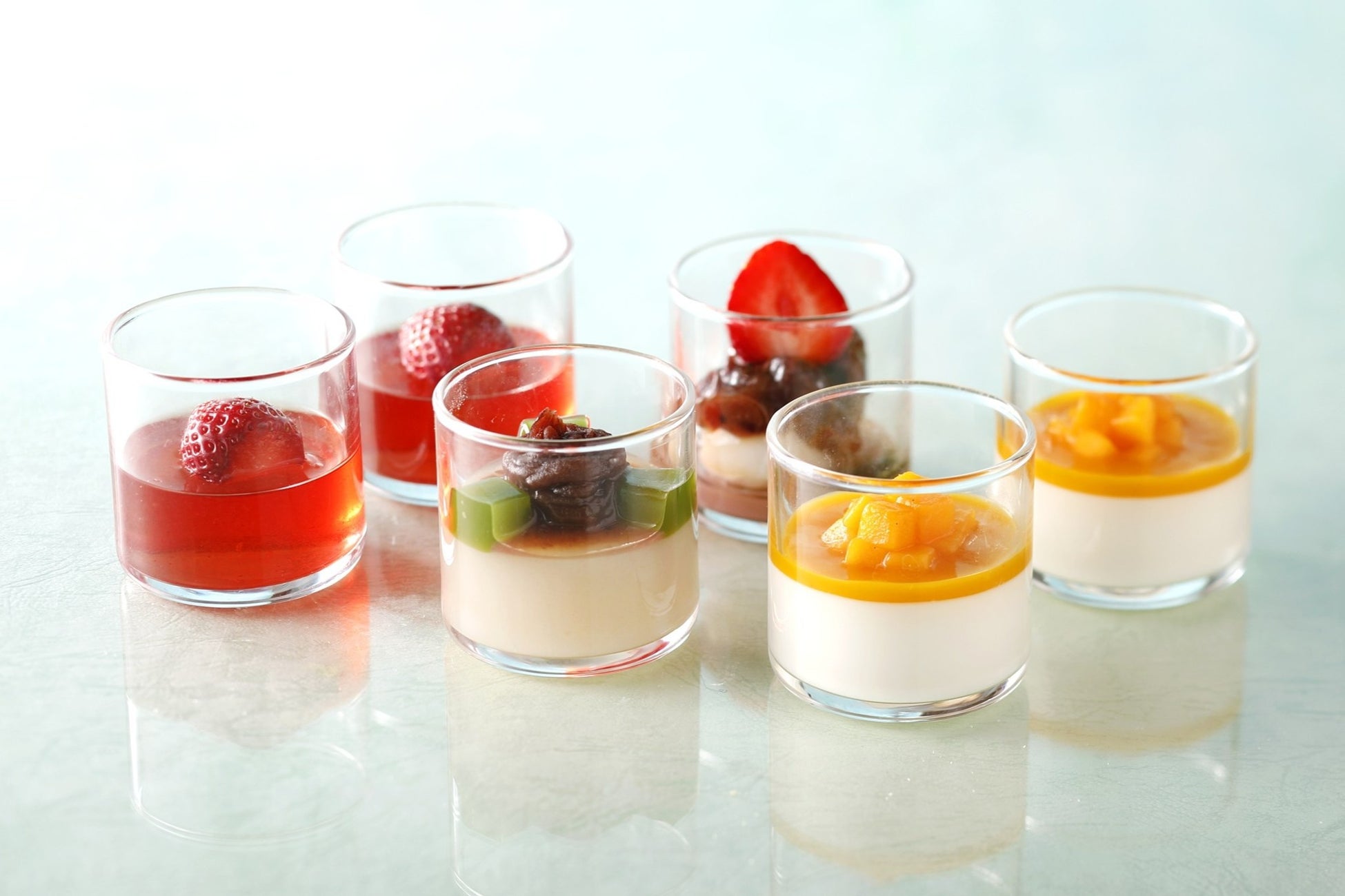 さらに、爽やかなグラススイーツもご用意。旬のいちごの果汁がぎゅっと詰まった「いちごゼリー」に、 元祖くず餅「船橋屋」の「くず餅乳酸菌®」を使用し、抹茶寒天やつぶあんをあしらった「新edoくず餅ゼリー」などがビュッフェ台を彩ります。