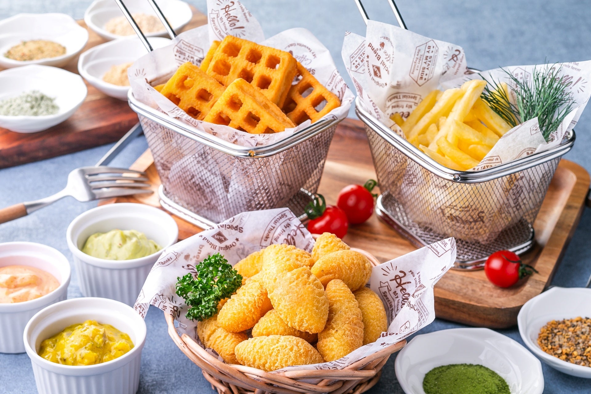 お子さまも大好きなフライドポテトはさまざまな形をご用意。のり塩やバター醤油などのシーズニングで好みの味付けにすることもできます。