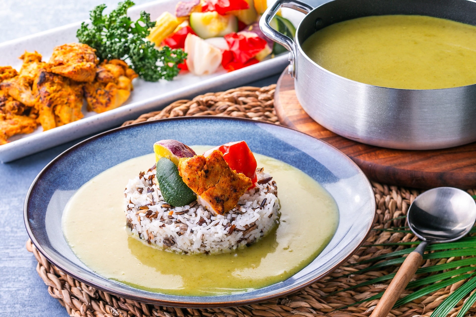 ココナッツのまろやかな甘みに、青唐辛子とハーブの香りが広がるカレーです。ぷちぷちとした食感のワイルドライスと、香りのよさが特徴のバスマティライスを合わせた「デュオライス」にかけ、温野菜を合わせるアレンジもおすすめです。