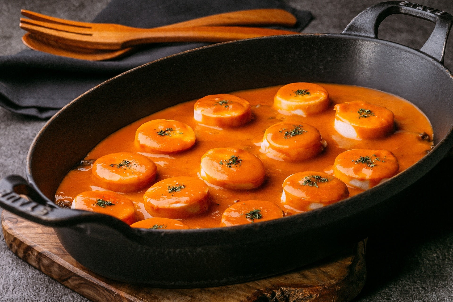 18世紀頃に活躍した女性料理人たちによって生み出された、フランス・リヨンを代表する郷土料理。魚のすり身に小麦粉などを加えて団子状にした「フランス風はんぺん」を、海の旨みが詰まったビスク(*1)と、きのこ風味が豊かなデュクセル(*2)とともに召し上がっていただきます。