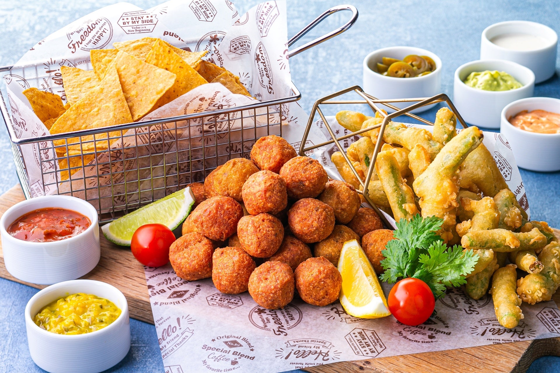 ひよこ豆をつぶし、丸めて揚げたコロッケのような食感のファラフェル。野菜のフリットとともに、ワカモレ、サルサ、マスタードなど、さまざまなディップソースで味の変化を楽しめます。