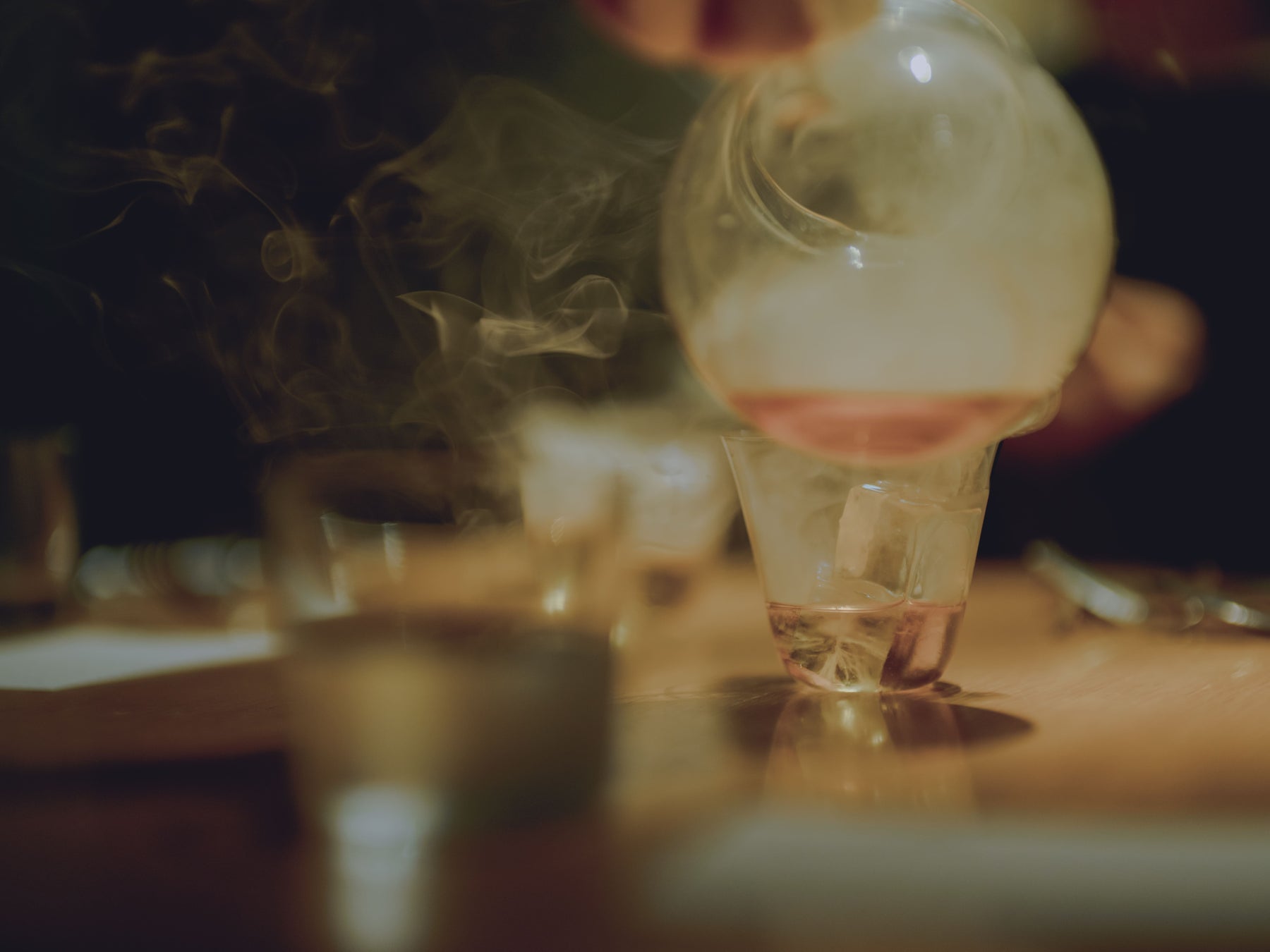 ▼梅酒ロック(燻製香) 料理:地魚のカルパッチョ 梅ドレッシング添え
